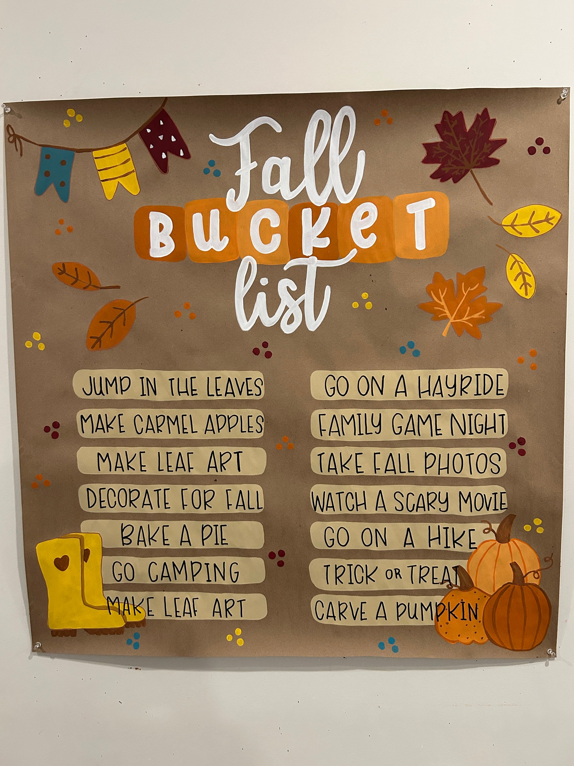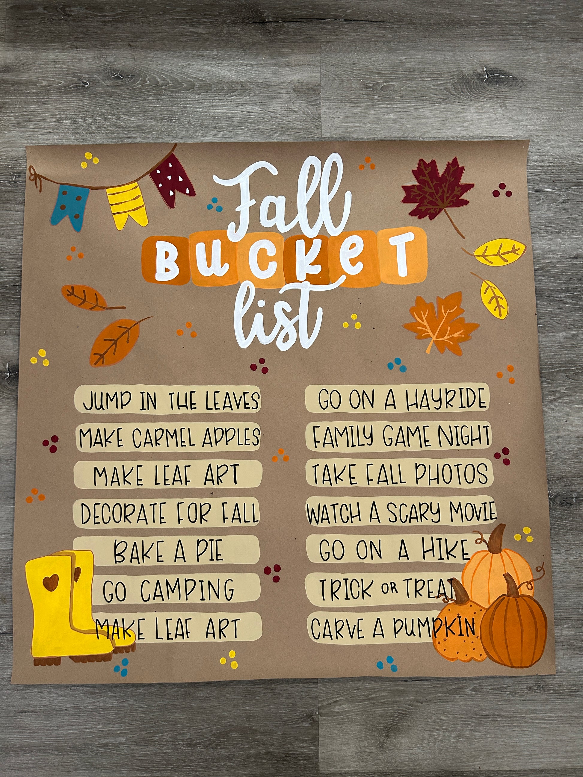 Celebrate the season with this Fall Bucket List Hand-Painted Banner! Perfect for autumn festivities, home decor, or fall parties, this handcrafted banner features vibrant fall accents. Each banner can list fun and cozy fall activities of your choice or can be left blank for you to fill in yourself. It is perfect for hanging on mantels, doorways, or walls. Adds a festive, personalized touch to your autumn celebrations! Banner is hand-painted on thick craft paper using acrylic paints.