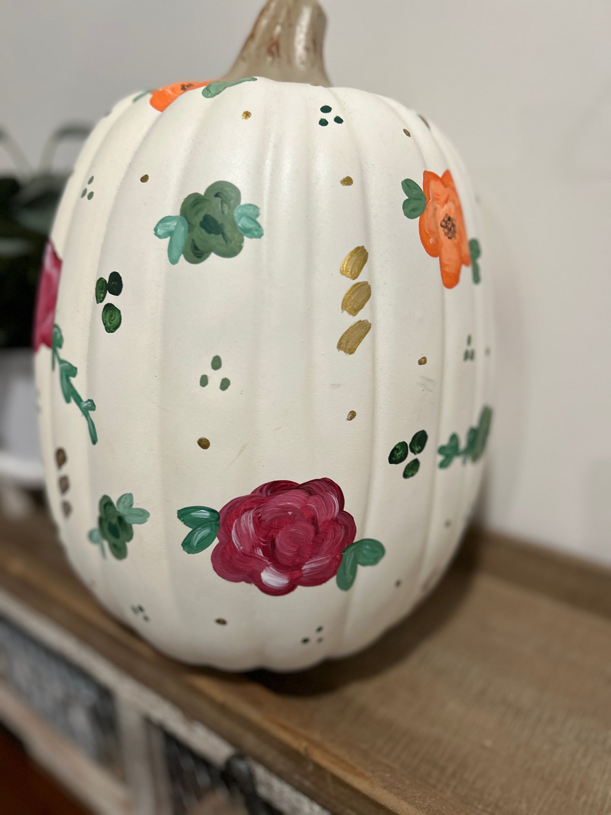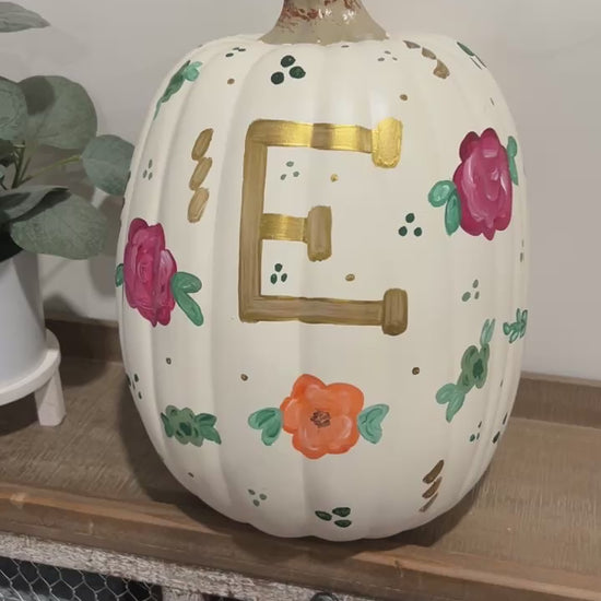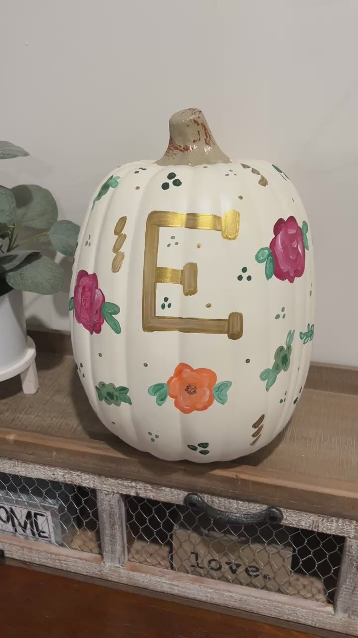 Bring autumn charm into your home with this one-of-a-kind hand-painted floral pumpkin. Each pumpkin is painted by hand with fall color florals. Perfect as a table centerpiece, mantel display, shelf accent, or entryway decoration, this piece adds a touch to your seasonal décor. Pumpkins are personalized with your name or initials.