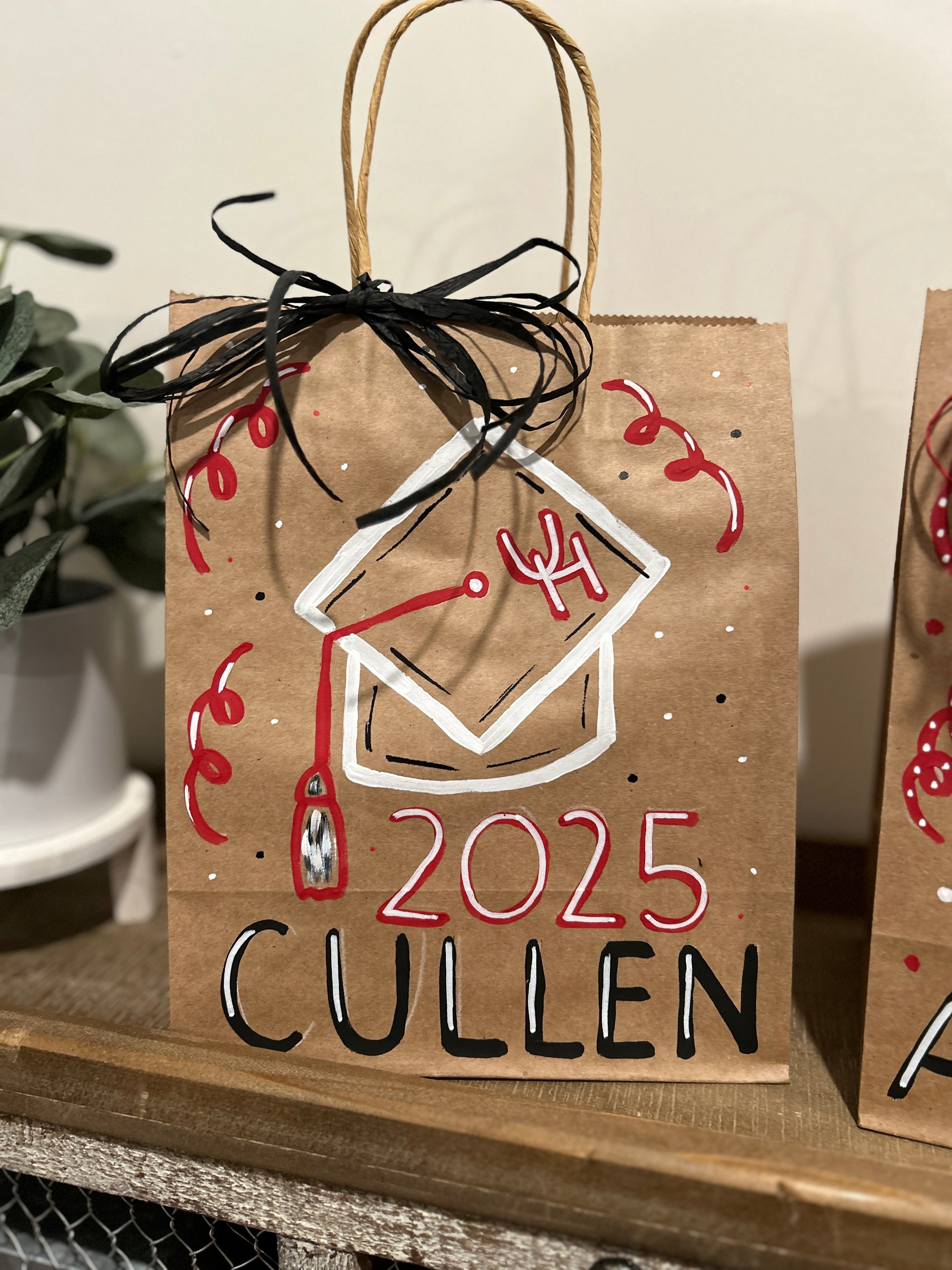 Celebrate your graduate in style with these hand-painted graduation gift bags! Made from high-quality kraft gift bags, each one is carefully painted by hand, giving it a personal and artistic touch that stands out from standard store-bought options.