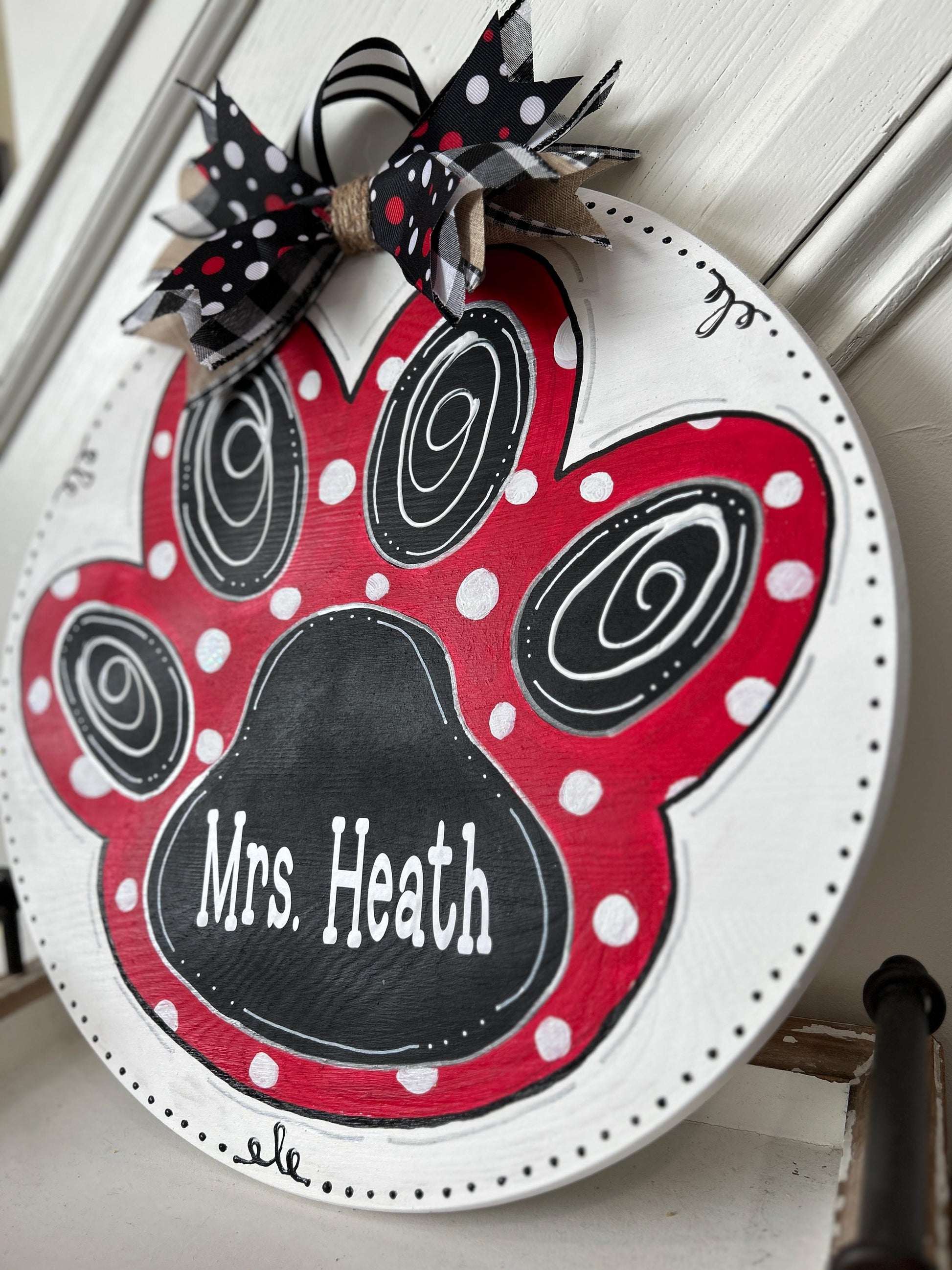 Lions paw door hanger is hand-painted on an 12" wood round 1/4" thick. Custom painted using acrylic paint and sprayed with a clear protective coating for indoor/outdoor use. Jute used for hanging. Door hanger can be painted using custom colors upon request. Since these are hand-painted no 2 door hangers are alike. There will be slight variations in each one.